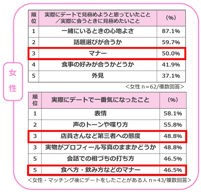 オンライン上でのやりとりと実際にリアルな場で会うデートでは、お相手に対する見極めポイントが変化して当然。そこで、マッチング後のデート経験者には“デートで見極めたいと思っていたこと”、“実際にデートで気になったこと”、そして、マッチングアプリを通したデート未経験者には、“デートで見極めたいと思うこと”について聞きました。すると、女性の方が、“店員さんなど第三者への態度”、“マナー”といった第三者視点がポイントとしてあがり、一方、男性は、“自分たちの将来に対する考え方が合うかどうか”、“趣味が合うかどうか”といったその後の生活をいかに二人で楽しめるのかを見極めたいと考えていることが分かりました。