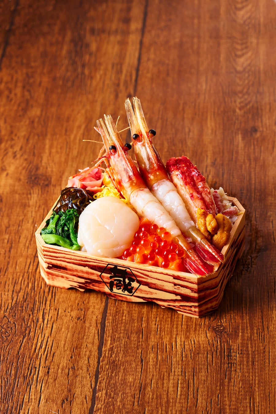 札幌「蔵」 特盛ボタン海老豪快弁当 (ボタンエビ・タラバガニ棒肉・ ズワイガニむき身・ホタテ・サーモン・ イクラ・ウニ、1折) 2,754円[各日限定200]◎催場