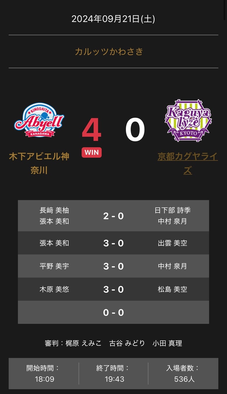 ノジマTリーグ 2024-2025シーズン 公式戦 9月21日開催 木下アビエル神奈川 vs 京都カグヤライズ 試合結果