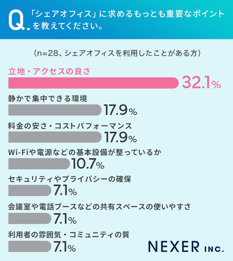 ■シェアオフィスに求めるもっとも重要なポイント、32.1%が「立地・アクセスの良さ」