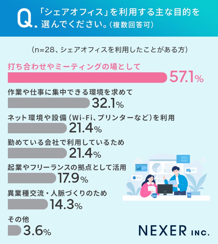 利用経験者の57.1%の方が、打ち合わせやミーティングの場として利用することが多いと回答しています。