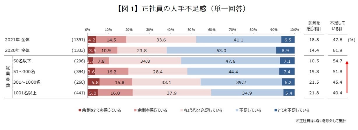 ◆2021年に中途採用を行った企業の正社員の人手不足感は、「余剰を感じる(とても感じている+感じている)」という回答が18.8%(前年比:4.4pt増)、「不足している(とても不足している+不足している)」は47.6%(前年比:14.3pt減)となった。2020年より人手不足感は大幅に緩和しており、2021年の中途採用では適切な人員数の確保ができていることがわかる。企業規模別にみると、不足感は従業員数が少ない企業ほど強い傾向にある。【図1】