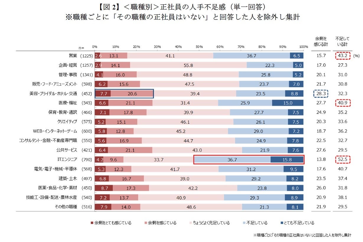 【図2】<職種別>正社員の人手不足感(単一回答)