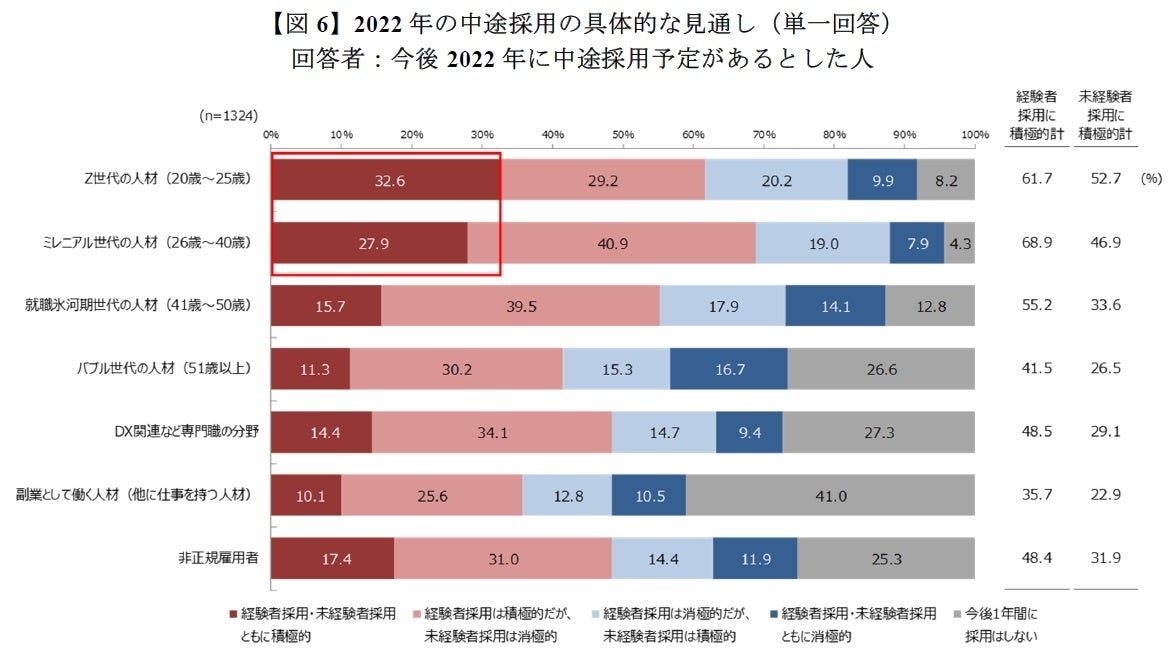 属性別では、「Z世代の人材」「ミレニアル世代の人材」で経験者採用、未経験者採用ともに積極的な傾向がみられる。2022年の中途採用は将来的に企業の中核を担えるような若手~中堅の人材を積極的に採用していくことが考えられる。【図6】