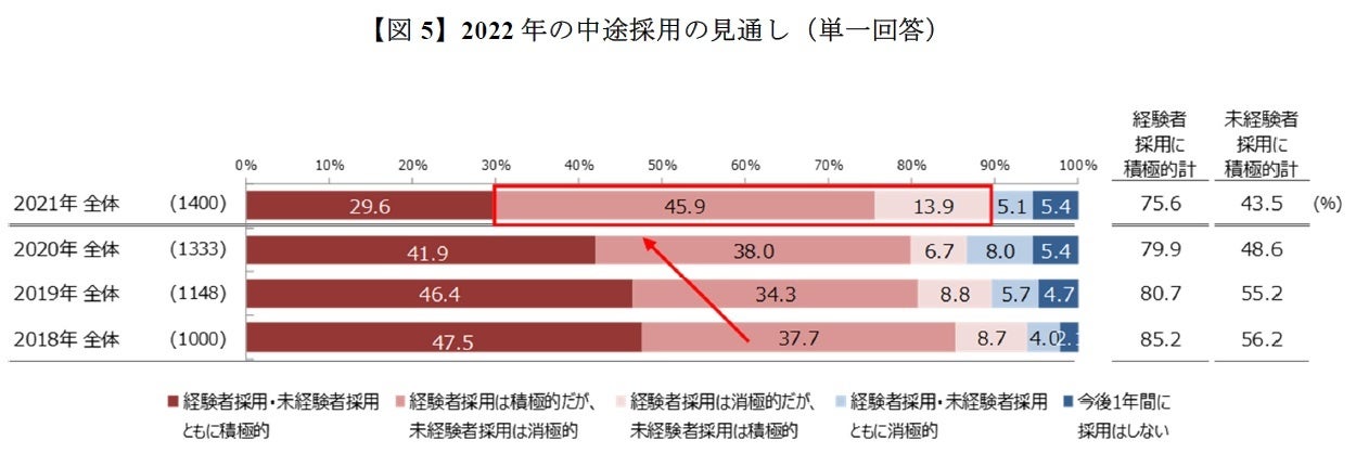 - 2022年の企業の中途採用の見通しは、経験者・未経験者どちらかでの採用に積極的が過去最高【図5、6】