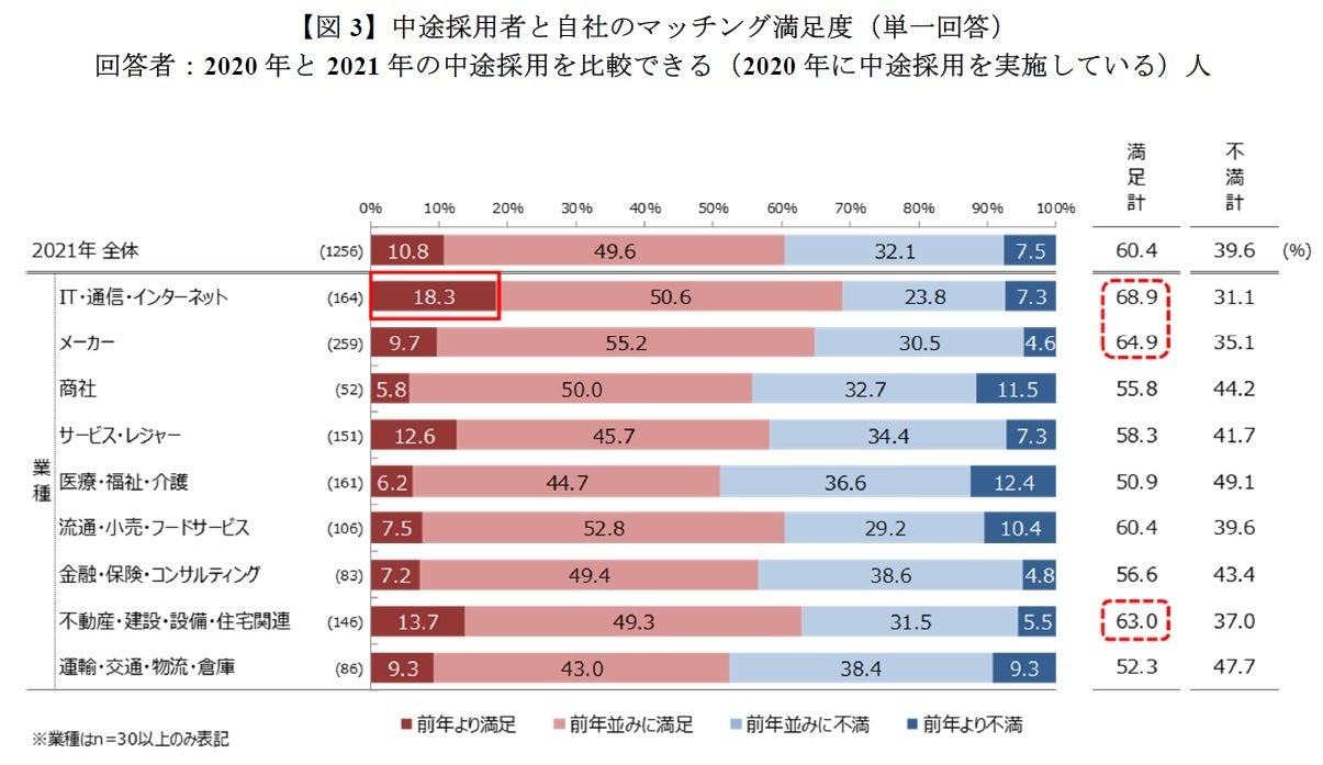 ◆2020年・2021年ともに中途採用を行った企業のうち、60.4%が2021年の中途採用者に満足していると回答。業種別では、「IT・通信・インターネット」「メーカー」「不動産・建設・設備・住宅関連」で「満足」という回答が多く、特に「IT・通信・インターネット」では「前年より満足」が18.3%となり、満足度が対前年比で最も向上している。【図3】