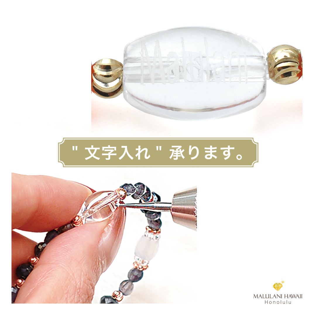 水晶には、Malulaniの文字の裏面に、お好きな英数字を6文字まで刻むことも可能。(+2,200円) お名前やイニシャル、お好きな数字を刻んだブレスレットは、特別なお守りとなるでしょう。