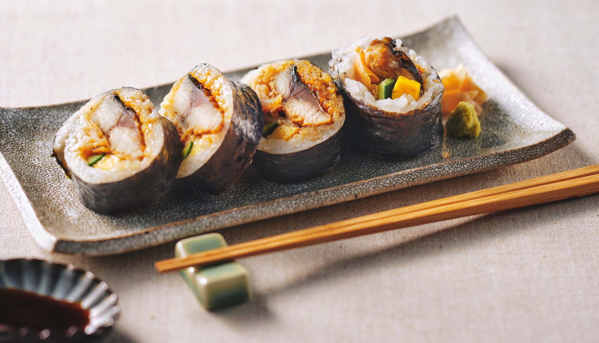 肉厚のサバ蒲焼を主役にした食べ応えのある巻きずしです。