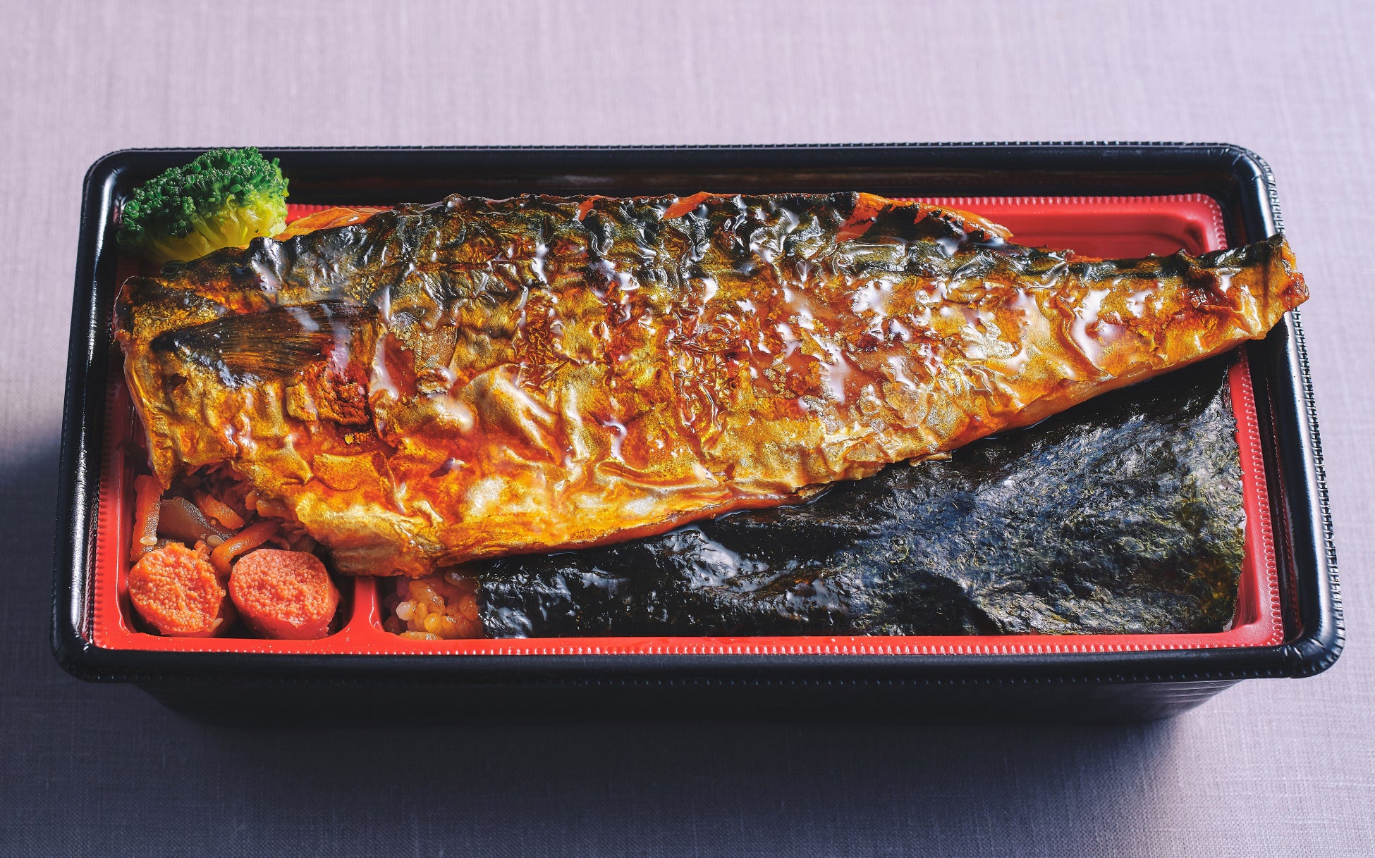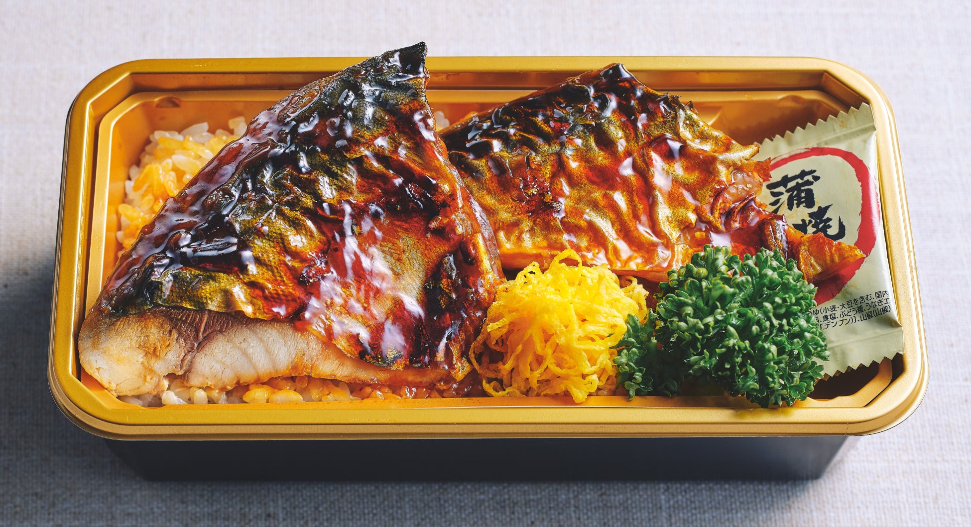 サバの半身を豪快にのせた、海苔弁仕立ての蒲焼丼です。