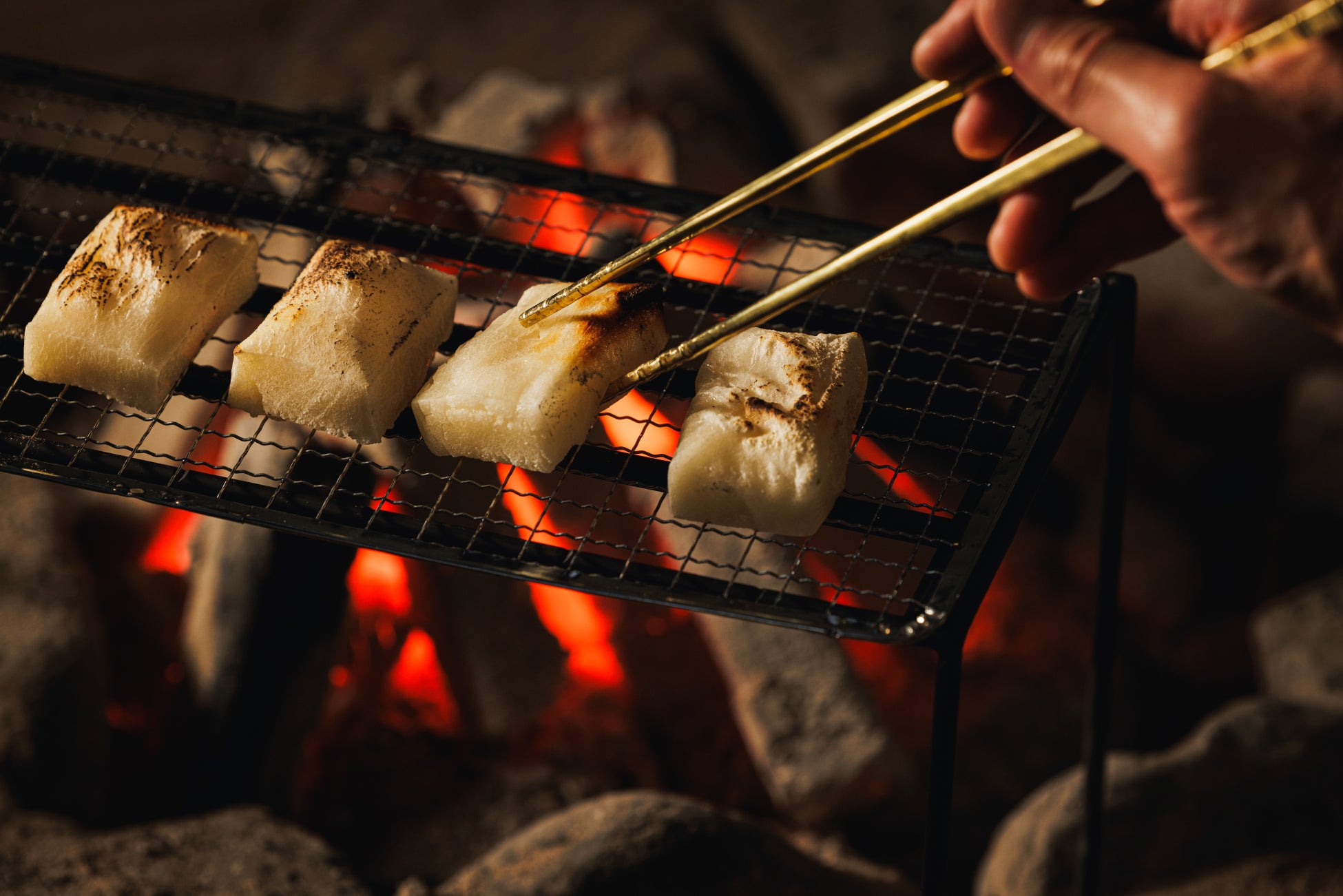 雪あかりに照らされた雁木の回廊の先に広がるのは、暖かな火が燃える囲炉裏の空間です。ここでは、信州の寒い冬に重宝されてきた餅を囲炉裏の炭火で焼き上げる体験ができます。長野県で一般的な角餅を、信州の醸造所で作られた2種類の味噌(ねぎ味噌、ごまくるみ味噌)を添えて味わいます。特に信州はくるみの名産地。地域性を深く感じるひとときとなります。