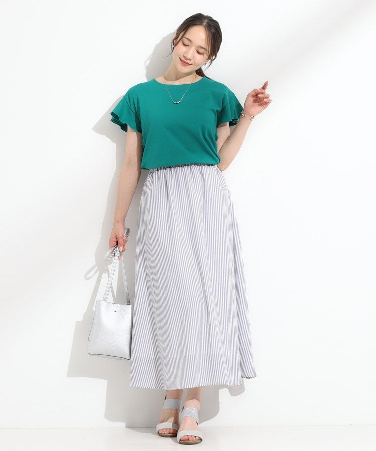 つるんとした滑らかな素材感が特徴で、Tシャツでも上品な雰囲気。袖のフリルデザインは女性らしさを演出しつつ、腕周りを自然にカバーしてくれます。