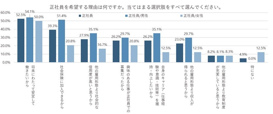 性別との関係をみると、「男性」のほうが「女性」よりも「社会保険に加入できるから」が30.6pt、「自身のキャリアを維持・向上したいから」が22.6pt、「他の雇用形態より社会的な信用度が高いと思うから」が18.4pt高くなった。保障や成長できる環境のほか、雇用形態からイメージされる周囲の印象も重要と考えているようだ。