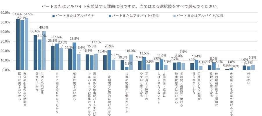 求人に応募した、パートまたはアルバイトを希望する人に、なぜその雇用形態を希望するのかをきいた(複数回答)。最も多かったのは「自分の都合のよい時間や曜日に働きたいから」で53.4%、次いで「生活との両立を図りたいから」が36.6%、「すぐに働き始めたかったから」が25.1%となった。