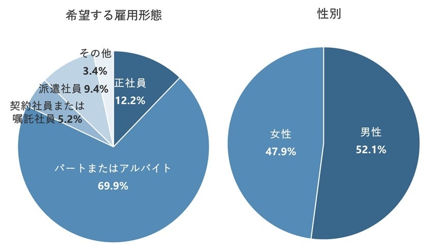 一方、「女性」のほうが「男性」よりも「扶養の範囲内で働きたいから」が12.9pt、「生活との両立を図りたいから」が8.7pt高くなった。限られた範囲の中で働くことのできるスタイルを探していることがわかる。