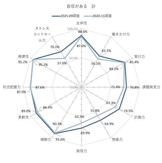 能力要素を個別にみると、特に「ストレスコントロール力」では「自信がある 計」は2020年11月調査時は57.0%だったが、2025年9月調査時は70.1%となり、13.1pt高い結果となった。このほか、「計画力」「想像力」「発信力」についても5pt以上割合が高くなった。一方、「主体性」「実行力」「傾聴力」「柔軟性」「状況把握力」「規律性」については、5年前の結果と比較しても大きな差は見られなかった。