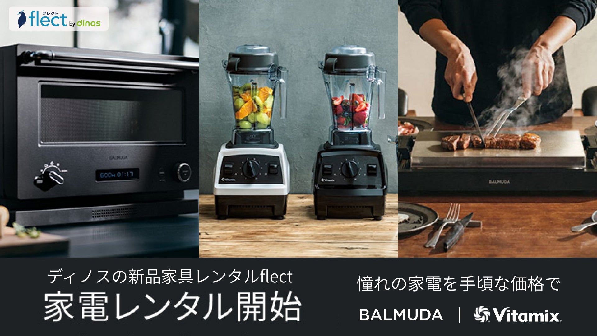 ディノスの新品家具レンタル『flect(フレクト)』は、50年以上の歴史を持つディノスの家具を中心に3,000品番を超える商品をラインアップしております。2024年6月にはガーデンファニチャーの取り扱いを開始し、その後こたつなど屋外や季節性のある家具のカテゴリーを拡充しております。そして、この度、以前よりお客様からご要望をいただいておりました家電製品の取り扱いを開始いたします。