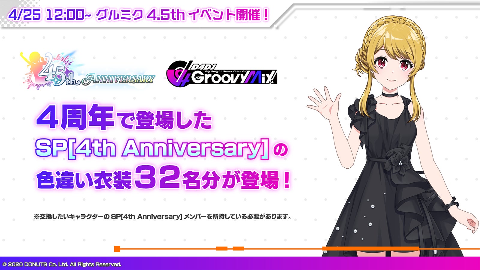 株式会社DONUTS(東京都渋谷区、代表取締役:西村啓成)が運営するスマートフォン向けリズムゲーム「D4DJ Groovy Mix」(以下グルミク)は、本日2025年4月25日(金)にアプリ配信開始から4.5周年を迎えました。これを記念して、楽曲実装やキャンペーンを開催いたします。