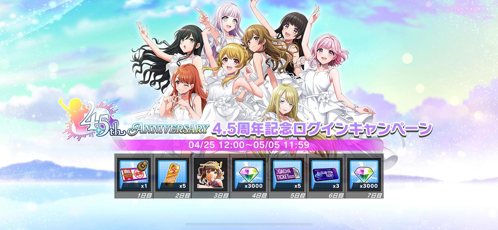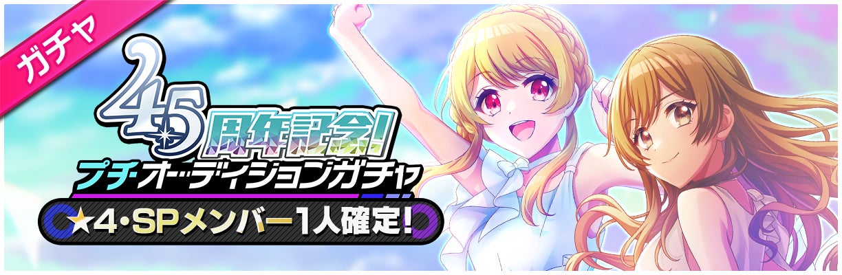 期間中毎日ログインすると、プチオーディションガチャで使用できる「採用証[4.5th Anniv.]」、ガチャチケット2025×5、ダイヤ6,000個 をプレゼント!