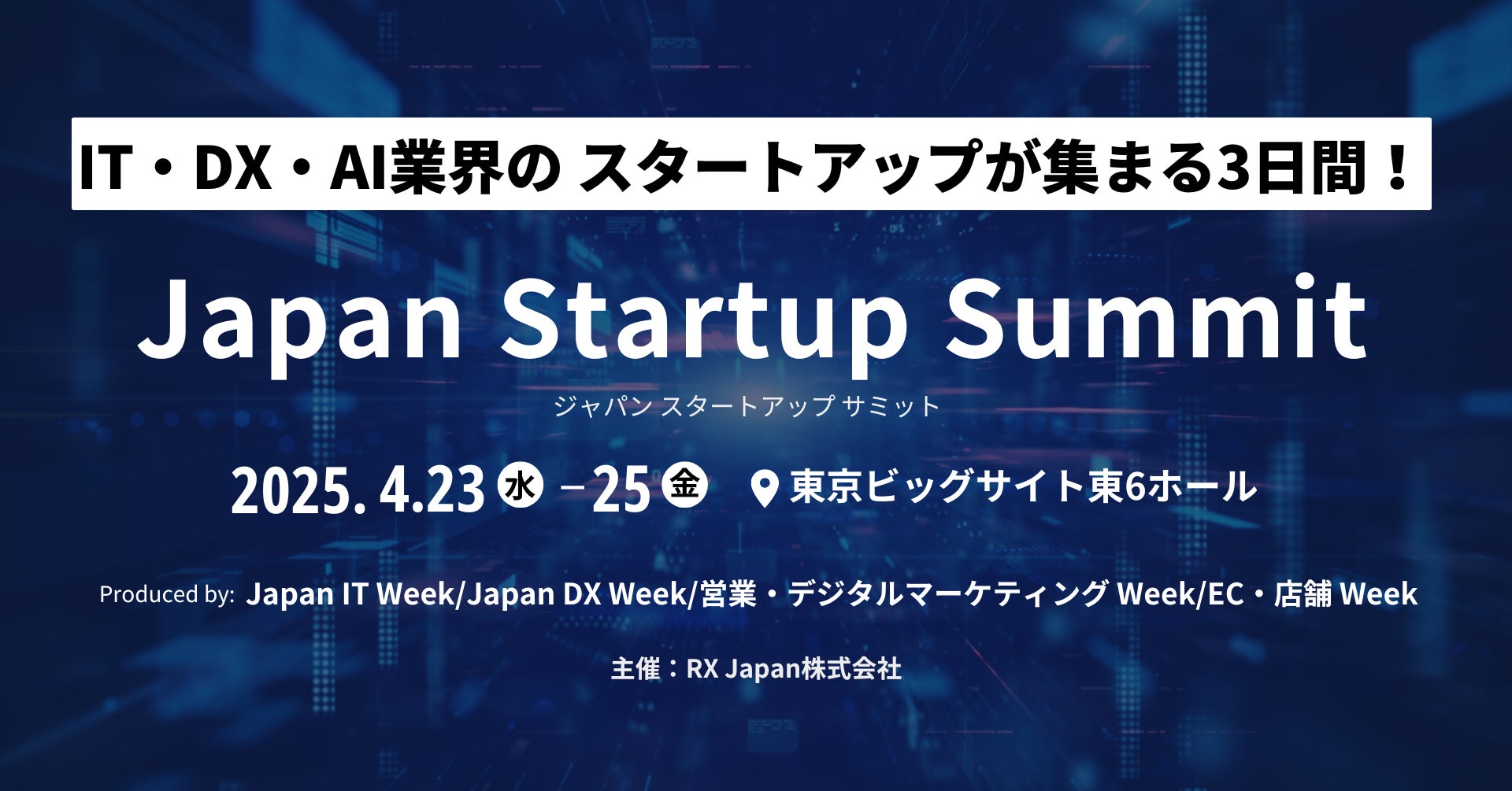 RX Japan株式会社(本社:東京都中央区、代表取締役社長:田中 岳志)は2025年4月23日(水)~25日(金)の3日間、「Japan Startup Summit」を950社*が出展する日本最大級のIT・DX総合展の特別企画として開催いたします。