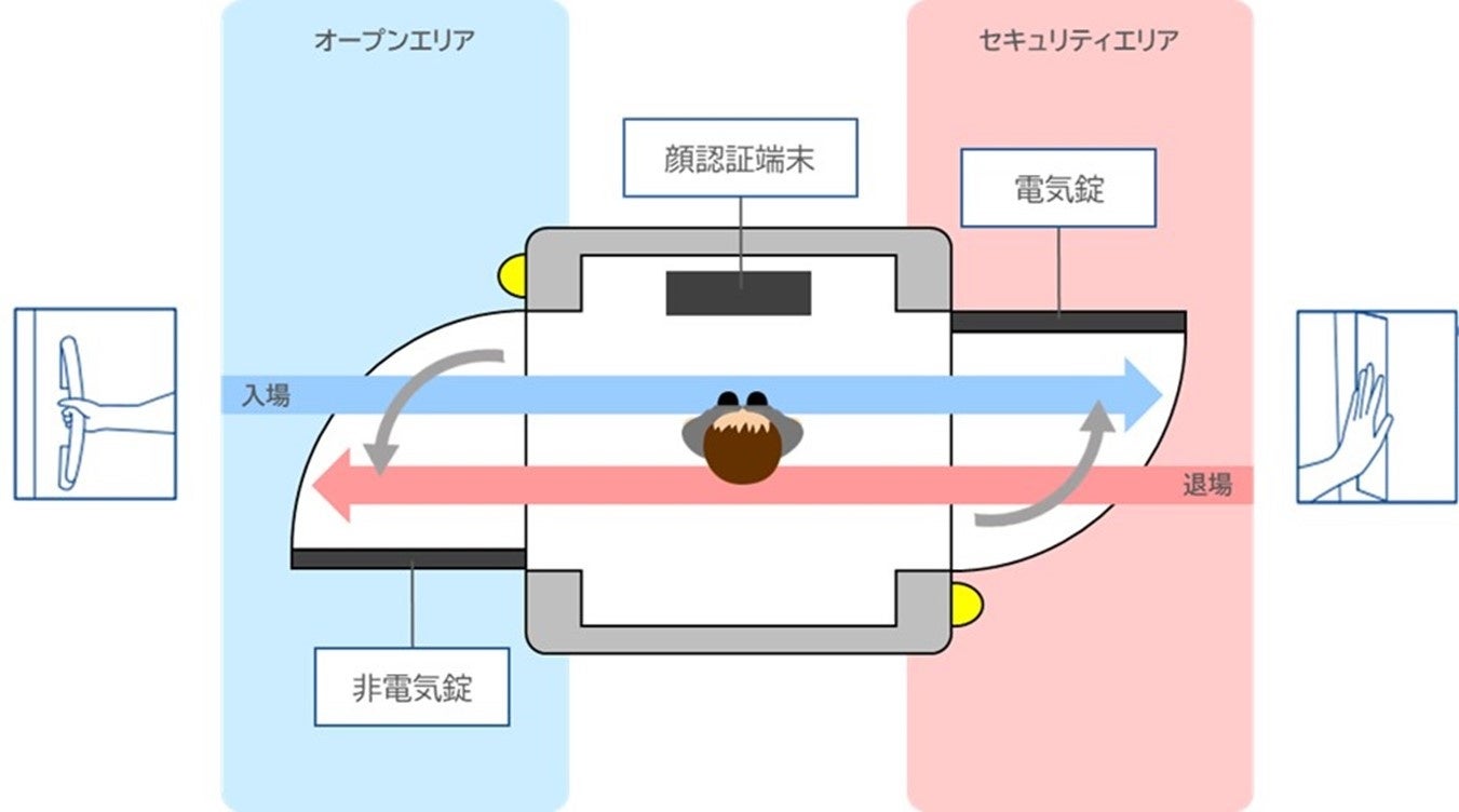 個室ブースの入場側を非電気錠扉、退場側を電気錠扉とすることで、自由に出入りできるオープンエリアと顔認証後に入れるセキュリティエリアの区分が可能です。個室ブースに入室後、顔認証が完了すると、退場側の電気錠扉が開きセキュリティエリア内へ進入できます。
