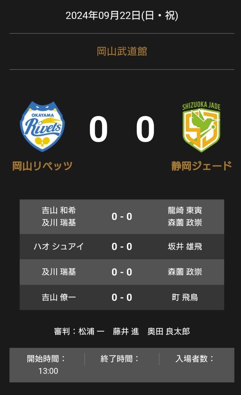 ノジマTリーグ 2024-2025 公式戦 9月22日開催 岡山リベッツ vs 静岡ジェード オーダー発表