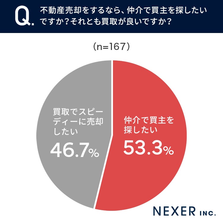 そこで今回は、不動産エージェントとのマッチングサービス『タクシエ(TAQSIE)』を運営する三菱地所リアルエステートサービス株式会社と共同で、事前調査で「将来的に不動産売却を考えている」と回答した全国の男女167名を対象に、「不動産の仲介と買取」についてのアンケートをおこないました。