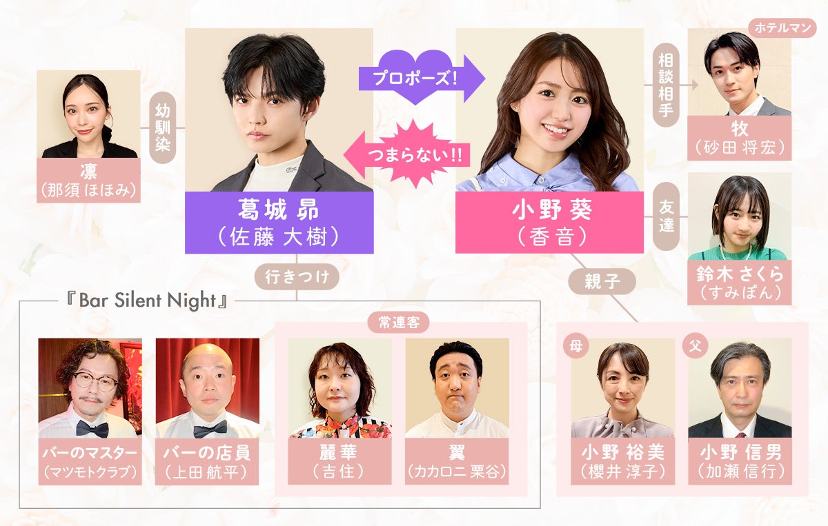 本作品は、佐藤大樹さん(EXILE/FANTASTICS)が演じる容姿端麗だが絶望的につまらないイケメンの主人公・葛城昴が、香音さんが演じる肉食系港区女子のヒロイン・小野葵にプロポーズすることからストーリーが展開される、新感覚ラブコメディです。共演者には、砂田将宏さん(BALLISTIK BOYZ)を始め、演技力に定評のある人気芸人の吉住さんやカカロニ・栗谷さんといった個性豊かな豪華キャスト陣が名を連ねています。また、人気芸人の上田航平さん(元ゾフィー)が初めてショートドラマの脚本を手掛けたことでも話題を集めています。「おもしろくなさ」を「おもしろい」で表現するという超高難度のラブコメディをぜひご覧ください。