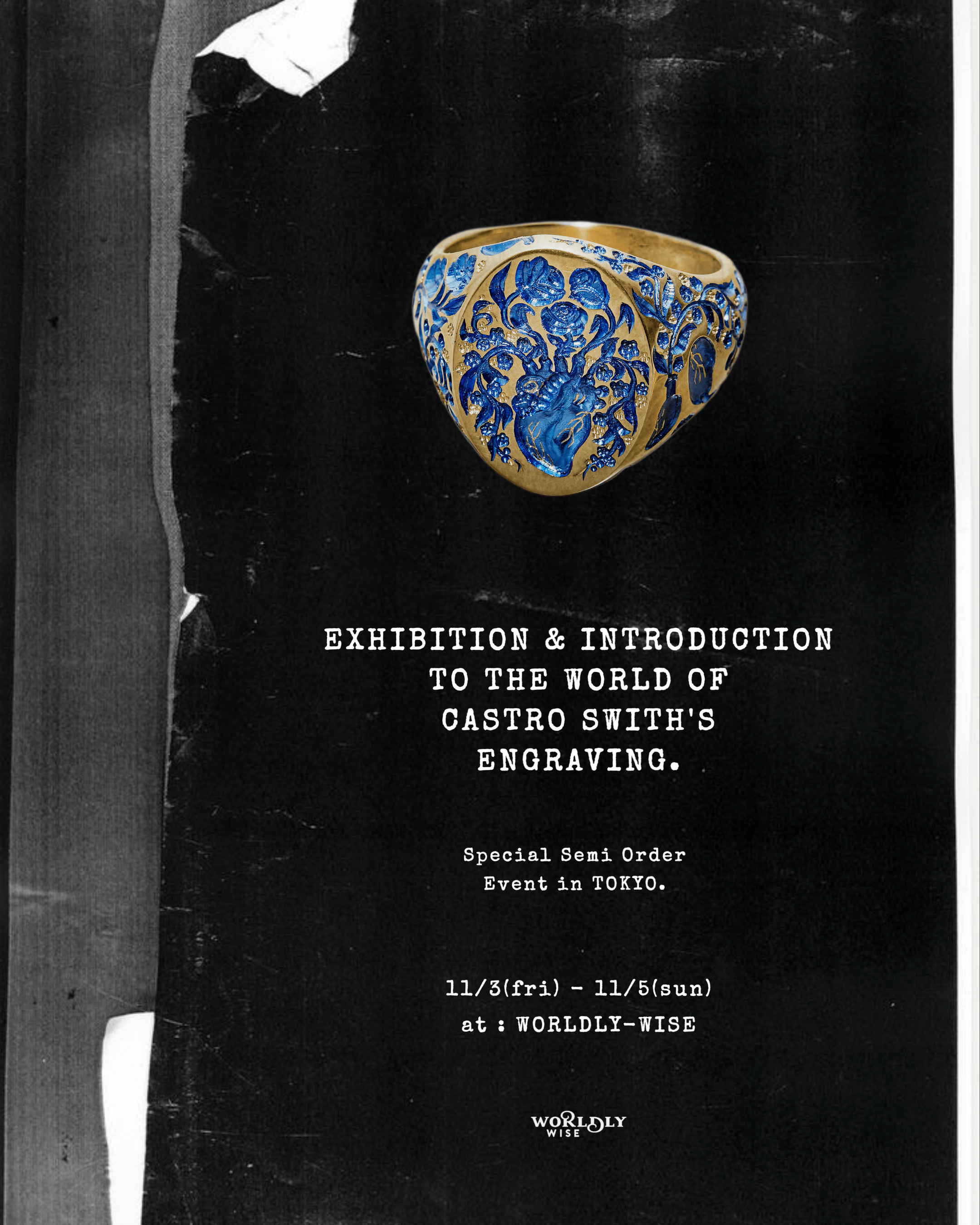 そんな世界が大注目するカストロスミスの作品を、およそ100点のボリュームで展示するセミオーダー会がWORLDLY-WISE 新宿店にて3日間限定で開催。初日の11/3(金)のみ、カストロ本人が在店し、また購入者には、希望するジュエリーへその場でカストロ本人がドローイングしたオリジナルのイニシャルデザインのオーダーサービスも行う。