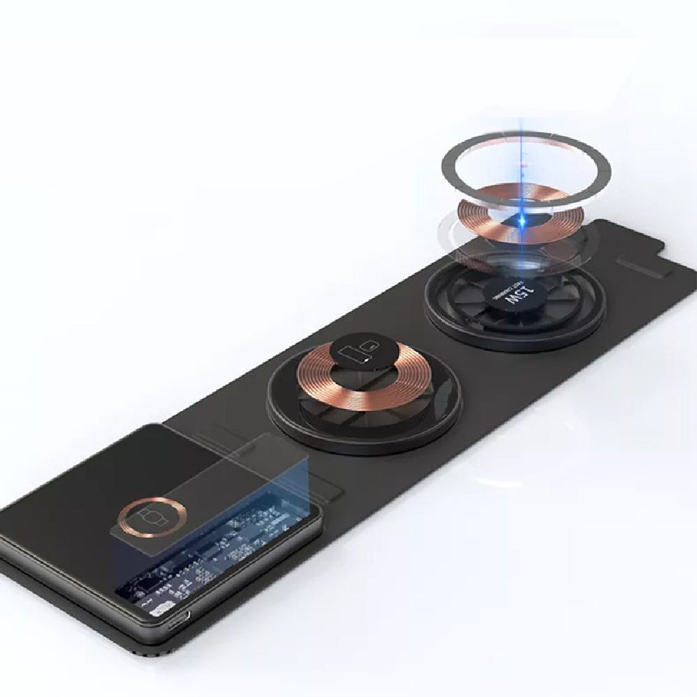 ●197g軽量コンパクト、広げた状態で3デバイスを同時充電。三つ折り式で、ポケットサイズで収納ができ、荷物を最小限にする便利なQiワイヤレス充電器