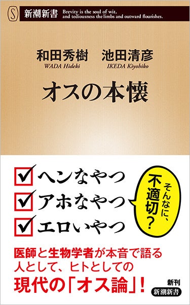 株式会社新潮社は、ベストセラーを連発する医師・和田秀樹さんと『ホンマでっか!?TV』でもおなじみの生物学者・池田清彦さんによる痛快対談『オスの本懐』(新潮新書)を8月19日(月)に発売いたします。コンプライアンスにポリティカル・コレクトネス、健康常識……と時代の変化や社会の要請に揉まれ、近ごろニッポンの男性は元気がありません。何かにつけて「不適切にもほどがある!」と叱られる世の中で、オスがオスらしく輝くためにはどうあるべきなのか、歯に衣着せずに本当のことを話す二人が痛快アドバイス。<日本のオス、必読>の1冊です。