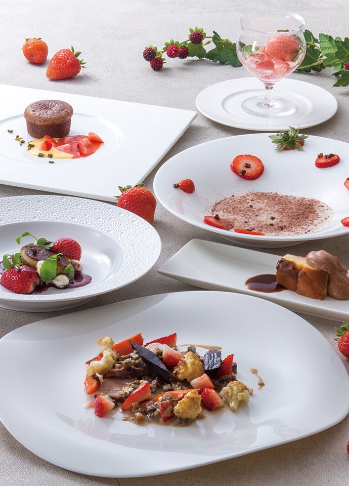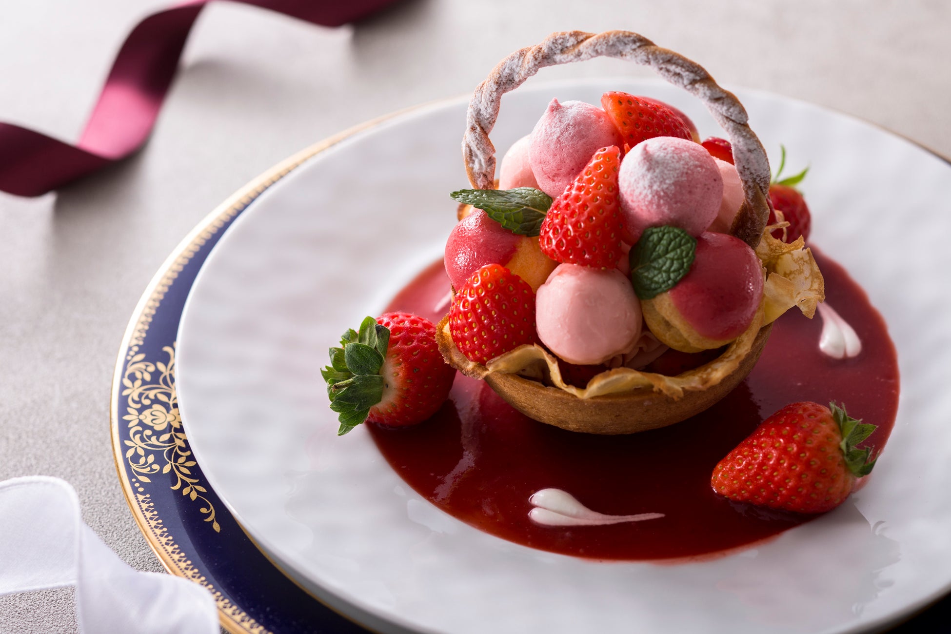 中でも、当ホテルの「大分県ベリーツ」を使用したメニューで初登場となるアシェットデセール(皿盛りデザート)「Panier de fraises(パニエ ド フレーズ)」は、クッキーで作ったバスケットにベリーツの他、スイーツが詰め込まれ、“苺狩り“をお皿で表現。