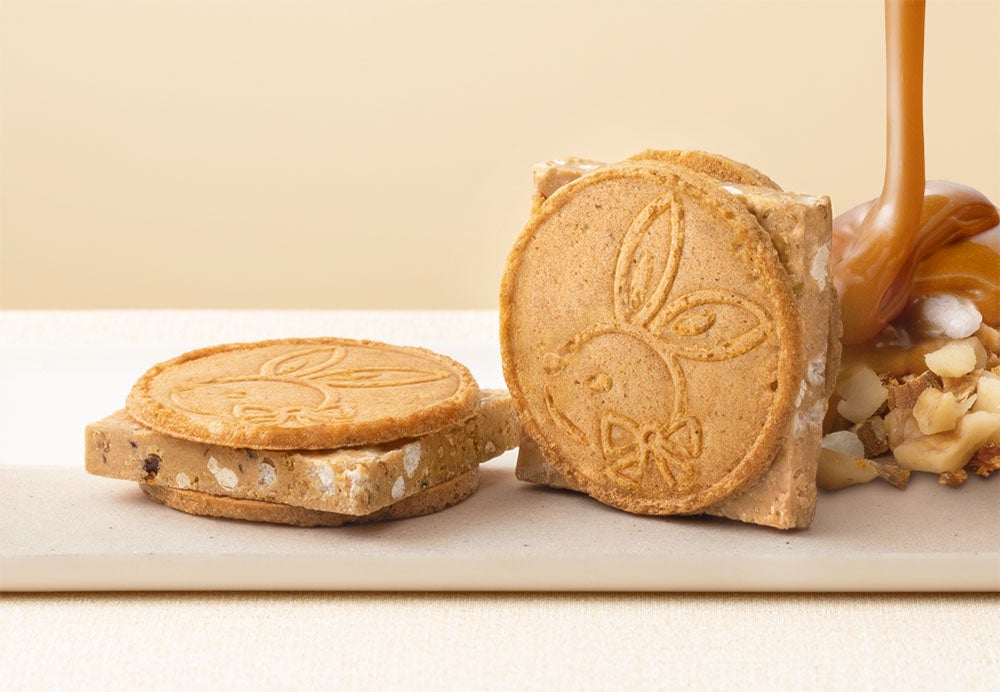 鎌倉五郎本店のシンボル“月うさぎ”が浮かぶ満月キャラメルナッツ生地に、 ほろ苦いキャラメルクランチショコラをサンド。ライスパフ・くるみ・アーモンド・キャラメリゼチップ・アーモンドクランチ・コーンフレーク、 6種類のおいしさを具沢山で盛り込んだ厚切りクランチショコラです。