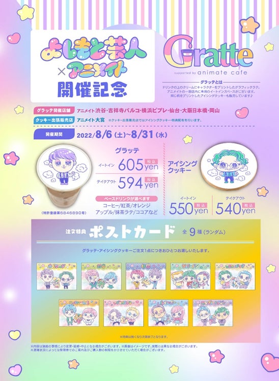 また、コラボを記念した『よしもと芸人×アニメイト』開催記念Gratte(グラフィックラテ・アイシングクッキー)を8月6日(土)よりアニメイトの一部店舗で販売いたします。