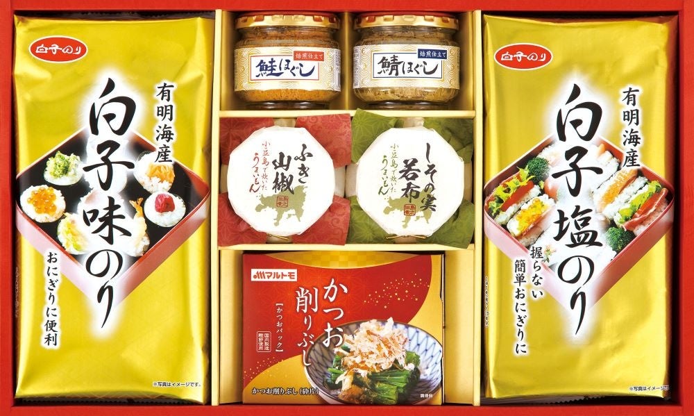 【内容】白子のり(塩のり・味のり)各2切5枚×各2、鮭ほぐし40g、鯖ほぐし40g、マルトモかつお削りぶし1.5g×4袋、しその実若布50g、ふき山椒45gの詰め合わせセットです。