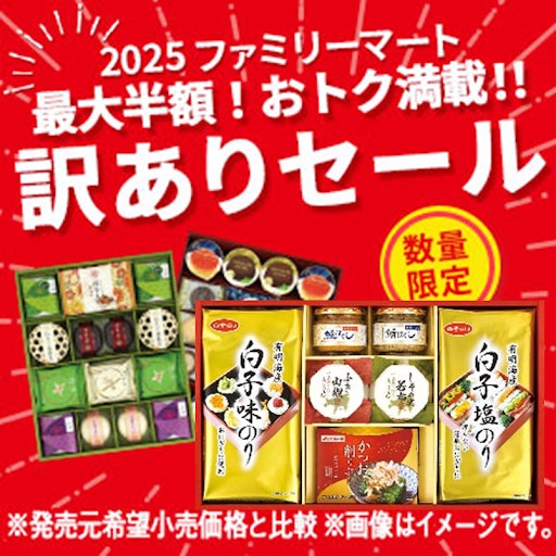 株式会社ファミリーマート(本社:東京都港区、代表取締役社長:細見研介)は、2025年1月14日(火)から、お歳暮ギフトの余剰在庫を最大半額(発売元希望小売価格との比較。以下同様)の割引価格でご提供する「訳ありセール」を開催しております。開始7日間の販売実績が、前回(2024年9月)のお中元の「訳ありセール」と比較して300%以上に伸長しており、半額商品の大部分がすでに完売御礼になるほど、お客さまから大変ご好評をいただいていることをお知らせします。