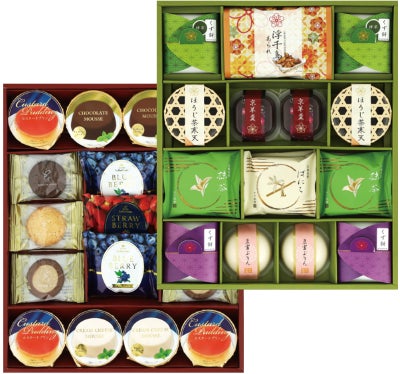 【内容】浮千鳥34g、ほうじ茶寒天72g×2、くず餅(黒みつ付)72g×2、くず餅抹茶(黒みつ付)72g×2、京羊羹64g×2、洋風煎餅(ばにら×2・抹茶×4)、豆富ぷりん64g×2、カスタードプリン75g×4、ムース(チョコ・チーズ)各75g×各2、クッキー(チョコチップ×4・ココナッツ×4)、モザイククッキーチョコ&ブルーベリー×4、ヴァッフェル(ブルーベリー×2・ストロベリー)の詰め合わせセットです。