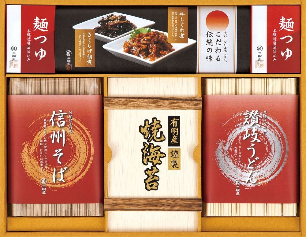 【内容】讃岐うどん50g×6、信州そば50g×6、焼海苔2切8枚、牛しぐれ煮55g、きくらげ佃煮80g、麺つゆ15g×4の詰め合わせセットです。