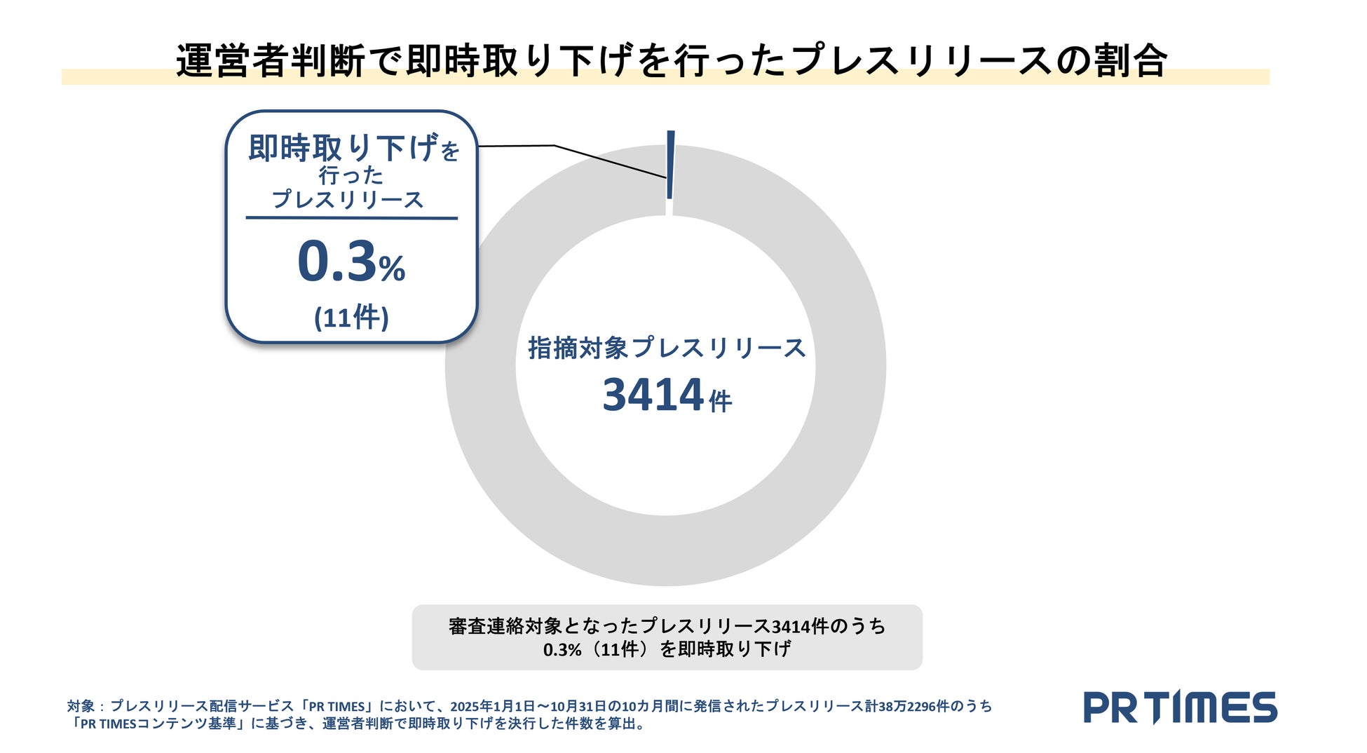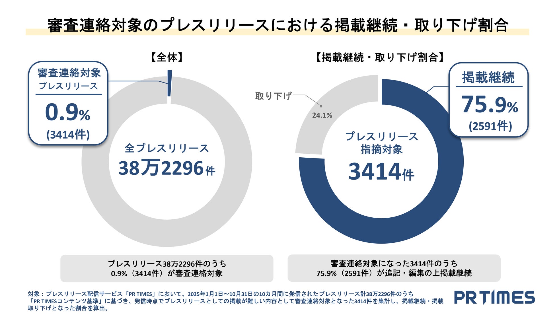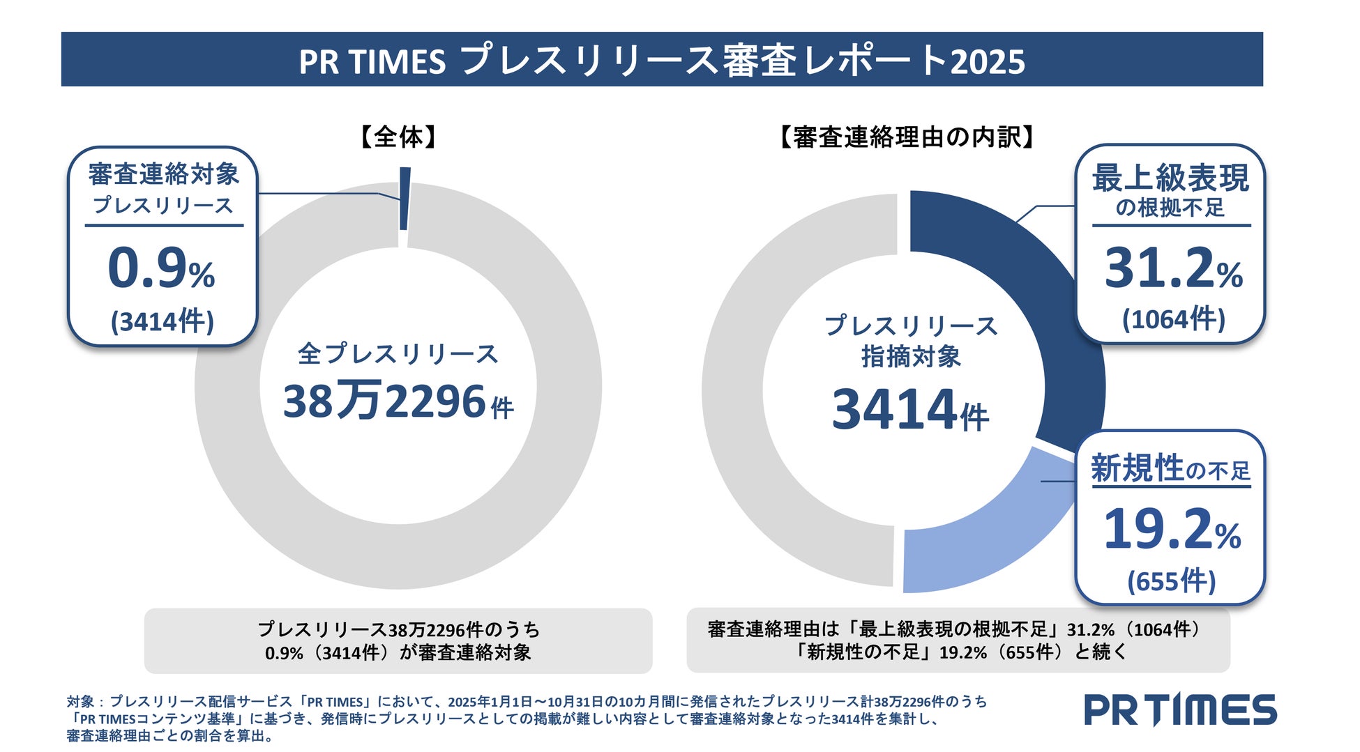 株式会社 PR TIMES(東京都港区、代表取締役:山口拓己、東証プライム:3922)は、2025年12月10日(水)、運営するプレスリリース配信サービス「PR TIMES」において、2025年1月1日~10月31日の10カ月間に発信されたプレスリリース計38万2296件に対する「PR TIMESコンテンツ基準(*1)」に基づく審査結果のレポートを発表いたしました。プレスリリース審査における基準の審査連絡の割合・内容やその分析について、当プレスリリースで発表いたします(審査連絡:ご配信いただいたプレスリリースに対して編集のご相談や事実確認をおこなうこと)。