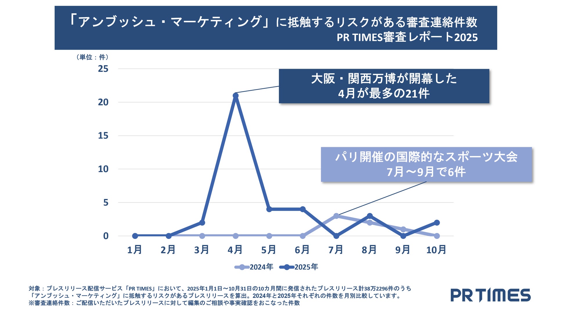 また、「アンブッシュ・マーケティング」に該当し得る理由で審査連絡をおこなったプレスリリースを、2025年月別に集計したところ4月の21件が最多となり、4月に開幕した大阪・関西万博の開催月に合わせた情報発信において「大阪・関西万博」の名称を用いて発表されたプレスリリースが増加傾向にありました。昨年にフランスのパリで開催された国際的なスポーツイベントに乗じた情報発信と比較しても、大阪・関西万博に乗じた情報発信の方が多く、自国開催のイベントであることも相まって、インバウンド需要を見据えた関西エリアの飲食店や宿泊施設が関連キャンペーンを実施するなど企業の情報発信が活発になることがわかりました。