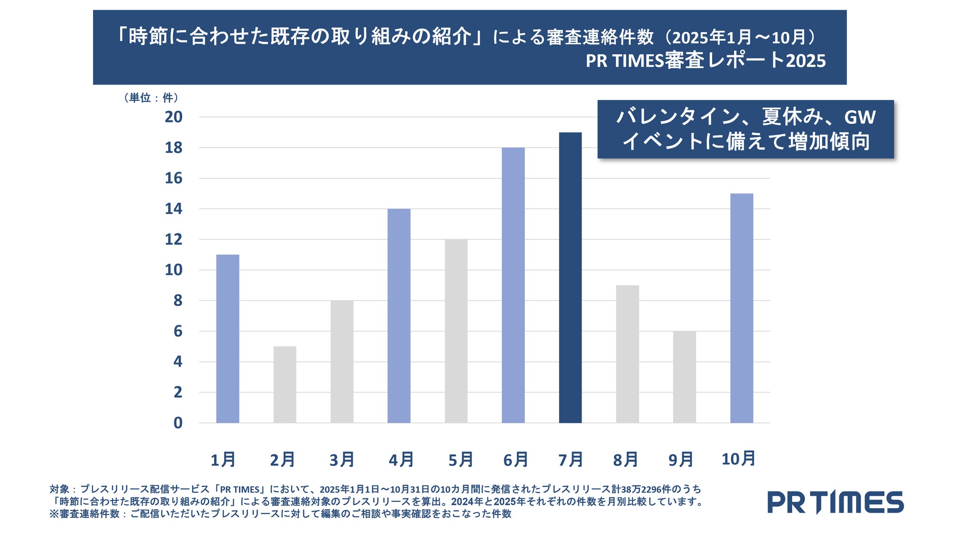 例えば、「時節に合わせた既存の取り組みの紹介」については、2024年は56件、2025年は117件となり昨対比で約2倍の増加件数が見られました。月別に分析すると、バレンタインに向けた発信(1月)、GW(4月・5月)、ハロウィン(10月)といった特定のイベントや、梅雨・猛暑(6月・7月)といった季節のニーズに合わせて、新規公開情報を伴わない既存の製品・サービス情報を発信するケースが増加していることがわかります。