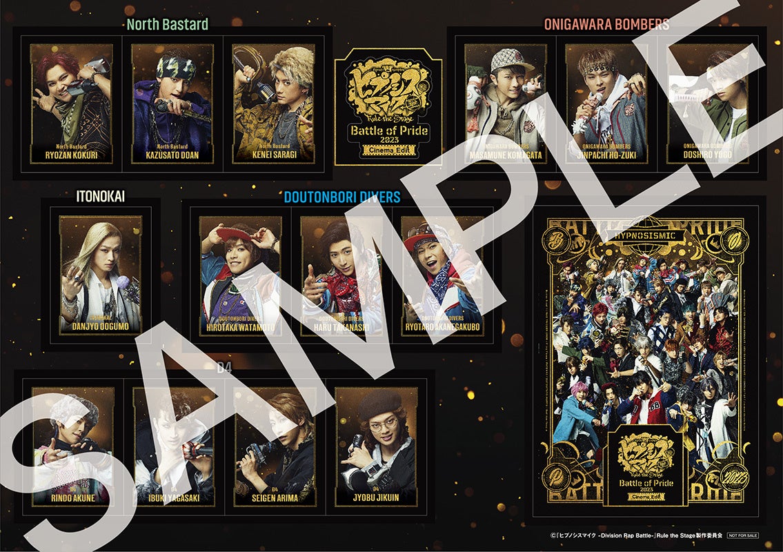 劇場公開1週目・2週目(2024年2月2日~2月15日)はイケブクロ・ディビジョン“Buster Bros!!!”、ヨコハマ・ディビジョン“MAD TRIGGER CREW”、シブヤ・ディビジョン“Fling Posse”、シンジュク・ディビジョン“麻天狼”、オオサカ・ディビジョン“どついたれ本舗”、ナゴヤ・ディビジョン“Bad Ass Temple”の6ディビジョンが表裏全6面に配置された3面パノラマカードを配布!