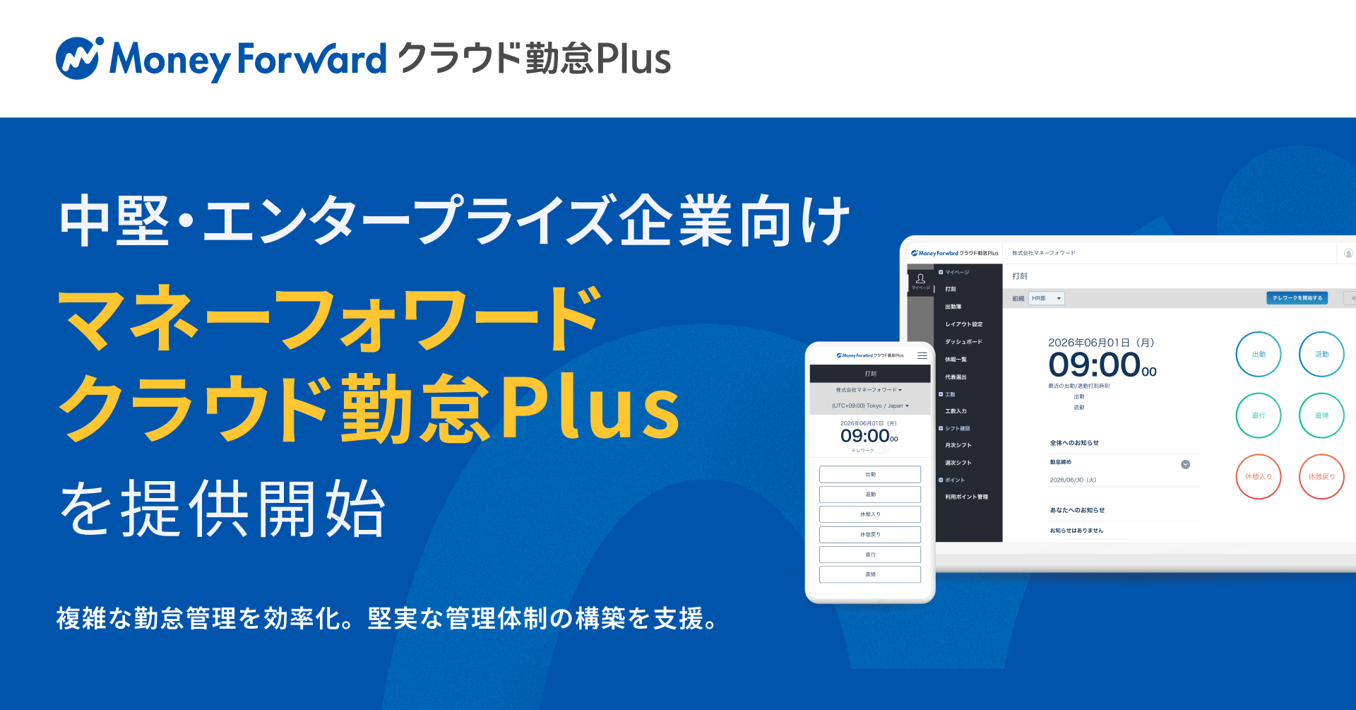 中堅・エンタープライズ企業向けのクラウド勤怠管理システム『マネーフォワード クラウド勤怠Plus』を提供開始