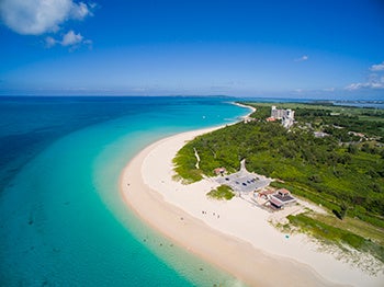 海上を渡る3本の橋を有し、ドライブが楽しめる宮古島。沖縄県内で最長の全長約3,540mもある伊良部大橋からは、爽快なパノラマ絶景が眺められる。砂山ビーチは、波で削られ門のような形となった隆起サンゴの岩がシンボル。粉雪のようにサラサラな白い砂浜と海のブルーのコントラストが美しく、多彩なマリンアクティビティや観光施設も充実し、のんびり島時間を満喫できる。