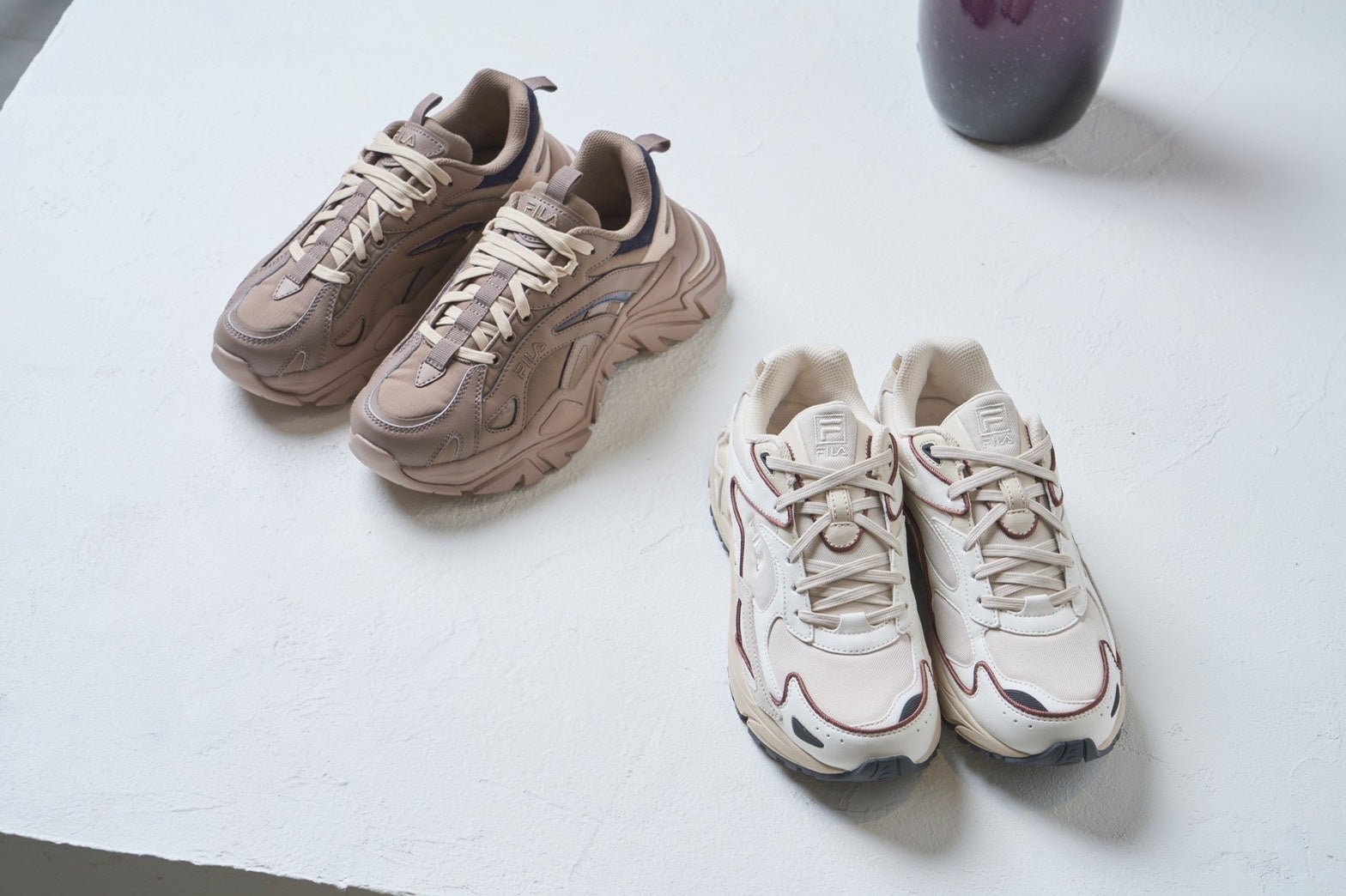 イタリア発のスポーツライフスタイルブランドFILAと初コラボレーション。ボリューム感が目を惹く人気モデルの“CATAPULT”と“INTERATION LIGHT”を採用。emmiらしくモードなカラーリングに仕上げ、大人がデイリーユースしやすいデザインに落とし込みました。インソールにはWネームが施された特別仕様です。