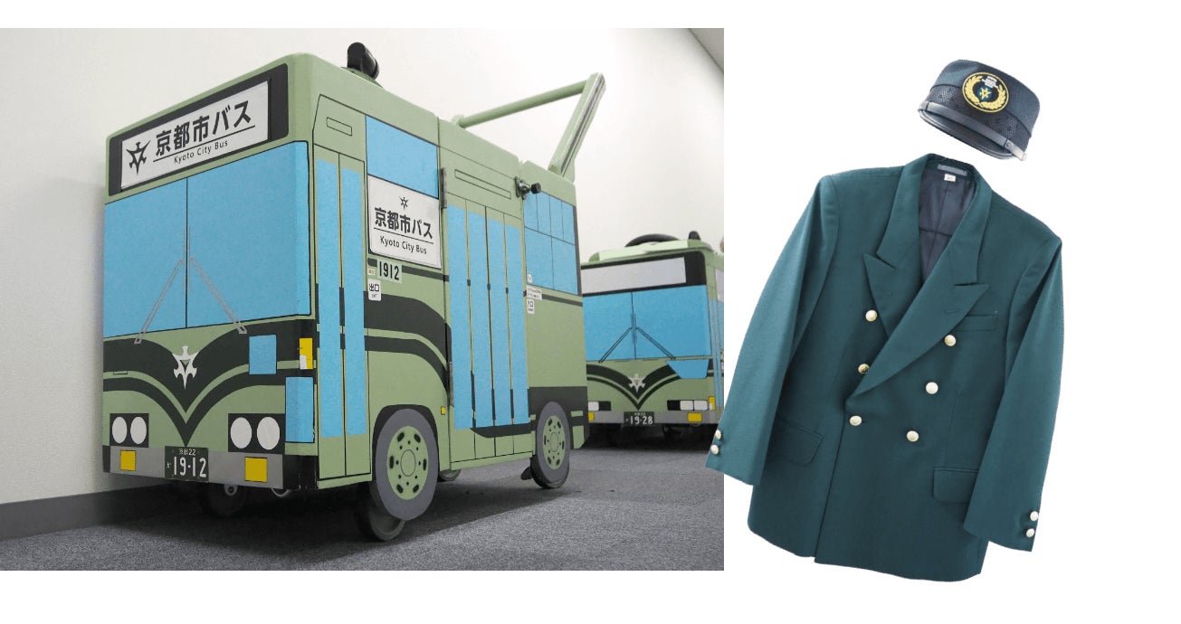 「市バスの運転士さんの制服を着て、ミニバスに乗って記念撮影」