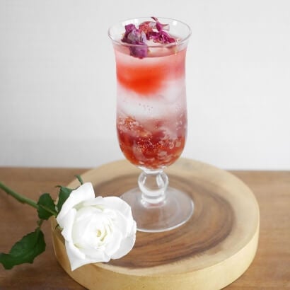 おくだ薔薇園で育てられた無農薬栽培の食べられる薔薇をたっぷり使った、香りもいただくデザートティー。〈未完〉が仕立てたプルッとしたジュレの薔薇と、〈mignon〉の林檎のフルーツティーの可憐なアレンジで。