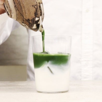 目の前で点てた濃厚な抹茶をミルクに注ぎ、その上に自家製抹茶アイスをのせた一杯。