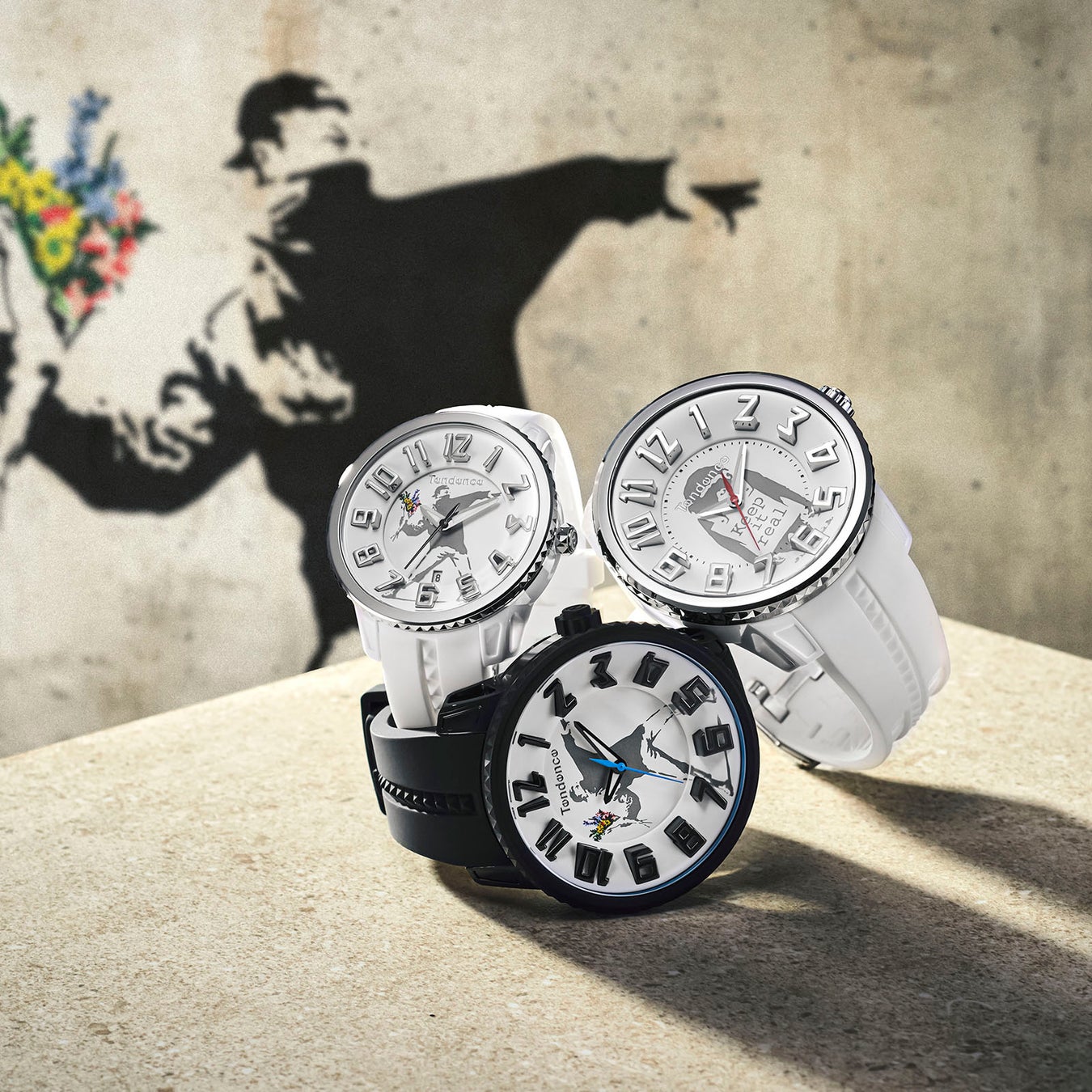 3DインデックスをはじめとするTendenceのアイコニックなタイムピースと創造性にあふれたバンクシーのグラフィティアートを融合。