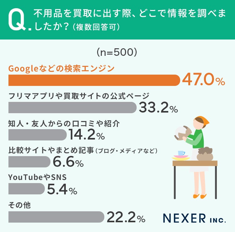 47%が「Googleなどの検索エンジン」、そして33.2%が「フリマアプリや買取サイトの公式ページ」と回答しています。