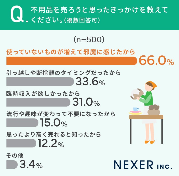 66%の方が「使っていないものが増えて邪魔に感じたから」と回答しています。